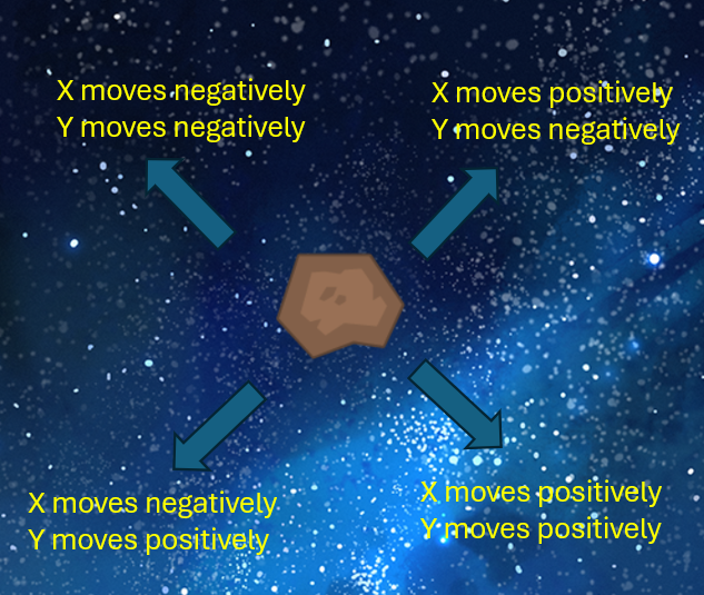 However, we also need to devise a way to have the meteor start off in a random direction. If we consider that the meteor essentially moves on a grid, and we can move x at any speed between -1 or 1, and we can do the exact same thing to y, then we can move the meteor horizontally by a certain amount, and vertically a certain amount each time the screen updates giving the appearance of it moving across the screen in a random direction.